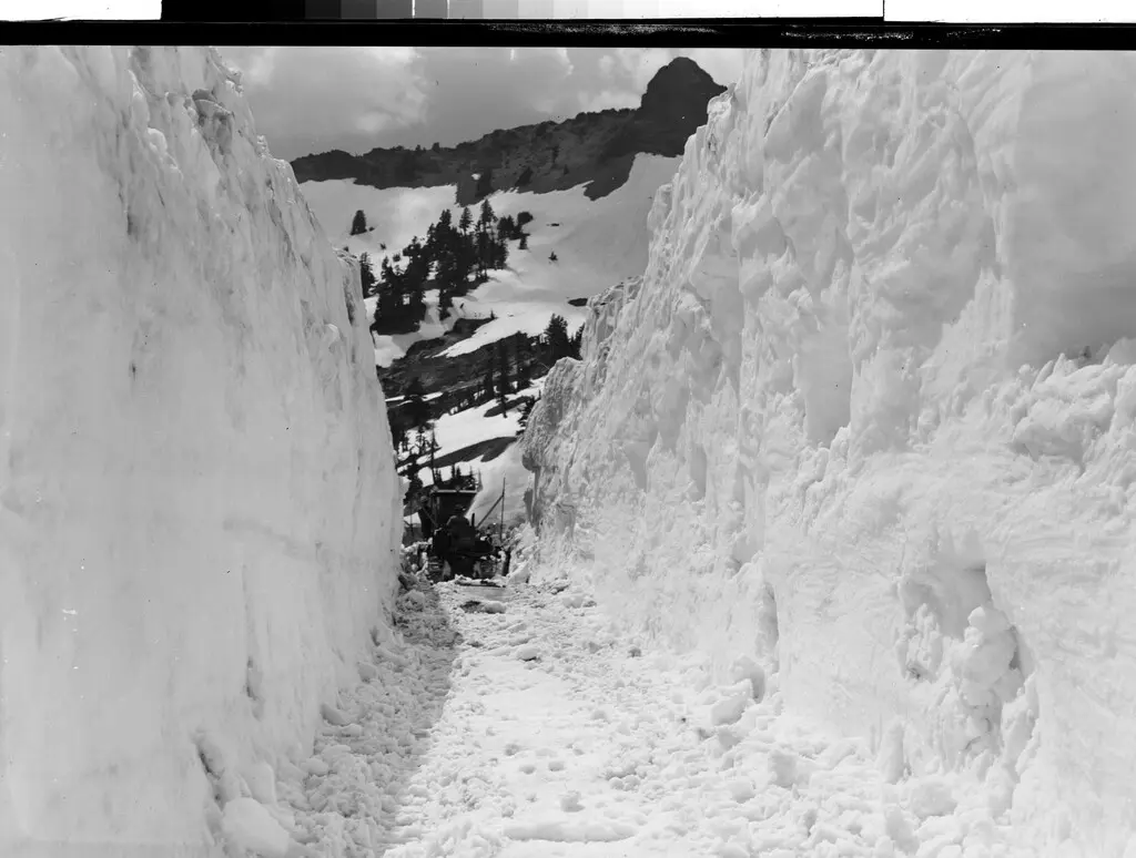 Location not stated -- appears to be Caterpillar dozer pushing snow to a Rotary Snowplow