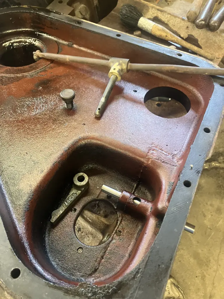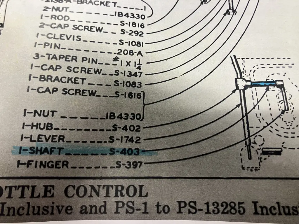 The Thirty that I like to play with has been laid up for the last few years because of a bad master clutch. As part of that project, I have been tightening up and checking on a few other things on the tractor. Something I have never done on this tractor is to replace the governor sleeve thrust bearing. When worn, these bearings can lose their balls and sometimes the balls go through the timing gears, making quite a mess. Thankfully, someone has had the front of this tractor open before and replaced a bunch of governor parts. The pins and flyweights are tight along with the sleeve on the shaft. The S397 finger has been replaced at some time; it is painted army green. My problem is that the S403 shaft was homemade and not a good candidate to copy to make a new one. Does anyone have a print for S403 so that I can make a correct one? I know the diameter .500", the length 4.500", and the hole sizes. What I do not know is the center-to-center distance of the holes and how they are clocked in relation to each other.